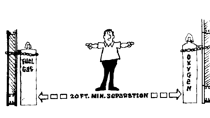 Do not store reserve stocks of cylinders containing flammable gases with cylinders containing oxygen. They should be segregated. Oxygen and fuel gas cylinders stored inside buildings should be separated by a minimum of 20 feet, or there should be a fire-resistive partition between them.