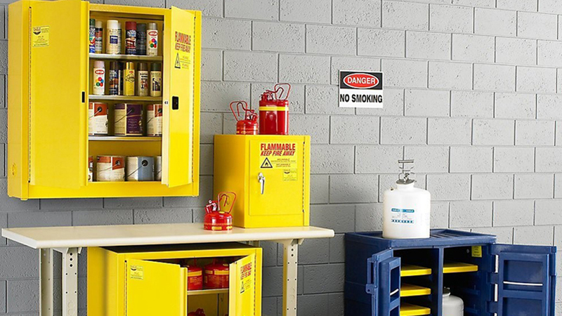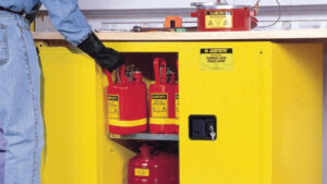 29 CFR 106(d)(3) and NAPA 30.4 – 30.7.1 require that the storage cabinet be constructed of double- walled 18 gauge metal or 1 inch wood cabinets with 2 inches sill and conspicuously labeled “FLAMMABLE KEEP FIRE AWAY.”