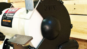 To be adequately contained in the event of failure, the wheel must be enclosed. A grinding wheel must never be operated without a protective enclosure. Enclosure requirements for bench and pedestal models specify 270 degrees of covering, which means the enclosure opening can be no more than 90 degrees. A properly adjusted tongue guard will help contain a failing wheel. The tongue guard must be set within 1/4 inch of the surface of the wheel.