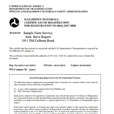 - The Certificate of Registration issued to the registrant by PHMSA.
