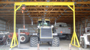 Gantry crane – a crane similar to an overhead crane except that the bridge for carrying the trolley or trolleys is rigidly supported on two or more legs running on fixed rails or other runway.