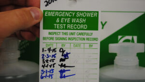 Proper maintenance and weekly testing are necessary to ensure that emergency eyewash and shower units are functioning safely and properly. Weekly testing helps clear the supply lines of sediment and bacteria build-up that is caused from stagnant water. Plumbed flushing equipment must be activated weekly for a period long enough to verify operation and ensure that flushing fluid is available. Portable and self-contained equipment must be visually checked to determine if the flushing fluid needs to be changed or supplemented.