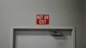Any door, passage or stairway that is neither an exit nor a way of exit access, and which is located or arranged and could be mistaken for an exit, is to be identified by a sign reading “Not an Exit” or similar designation. A sign indicating its actual character, such as “To Basement,” “Storeroom,” “Closet” or the like, would be a good idea.